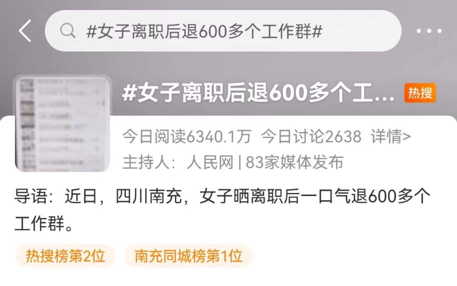 近日,四川南充的唐女士发布视频称,她离职后一口气退600多个工作群!该视频迅速登上热搜,引发网友热议。