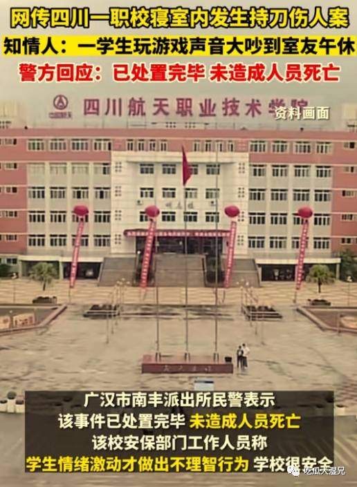12月13日,有网民发消息称,12月12日晚,在四川航天职业技术学院寝室内发生一起伤害案,据称起因是一学生玩电脑声音太大影响到他人休息,两人发生冲突,一人持刀将另一人捅伤。网传图片显示,该起伤害案发生在寝室内,一名学生坐在电脑前玩耍,他的身后有一滩血迹。四川航天职业技术学院寝室内发生一起伤害案。(网传来自网络)13日上午,大皖新闻记者致电事发学校所在的四川德阳广汉市南丰派出所,值班民警表示,警方12日已经出警处置该起事件,目前已经处置完毕,事件未造成人员死亡。知情人士告诉记者,事情发生在12日中午,因为一位同学在玩游戏时很吵影响到了另一位同学休息,于是两人发生争吵,一人被刀捅伤,之后被救护车拉走,当晚受伤学生没有回到宿舍。当天,记者从该校宣传部门了解到,该起事件已经处置完毕,没有造成学生死亡。另据该校安保部门工作介绍,这是一起个例事件,学生在情绪激动的情况下才做出不理智的行为,学校很安全,学生的人身安全能够得到保证,学校将会通过官方渠道,向公众澄清此事。