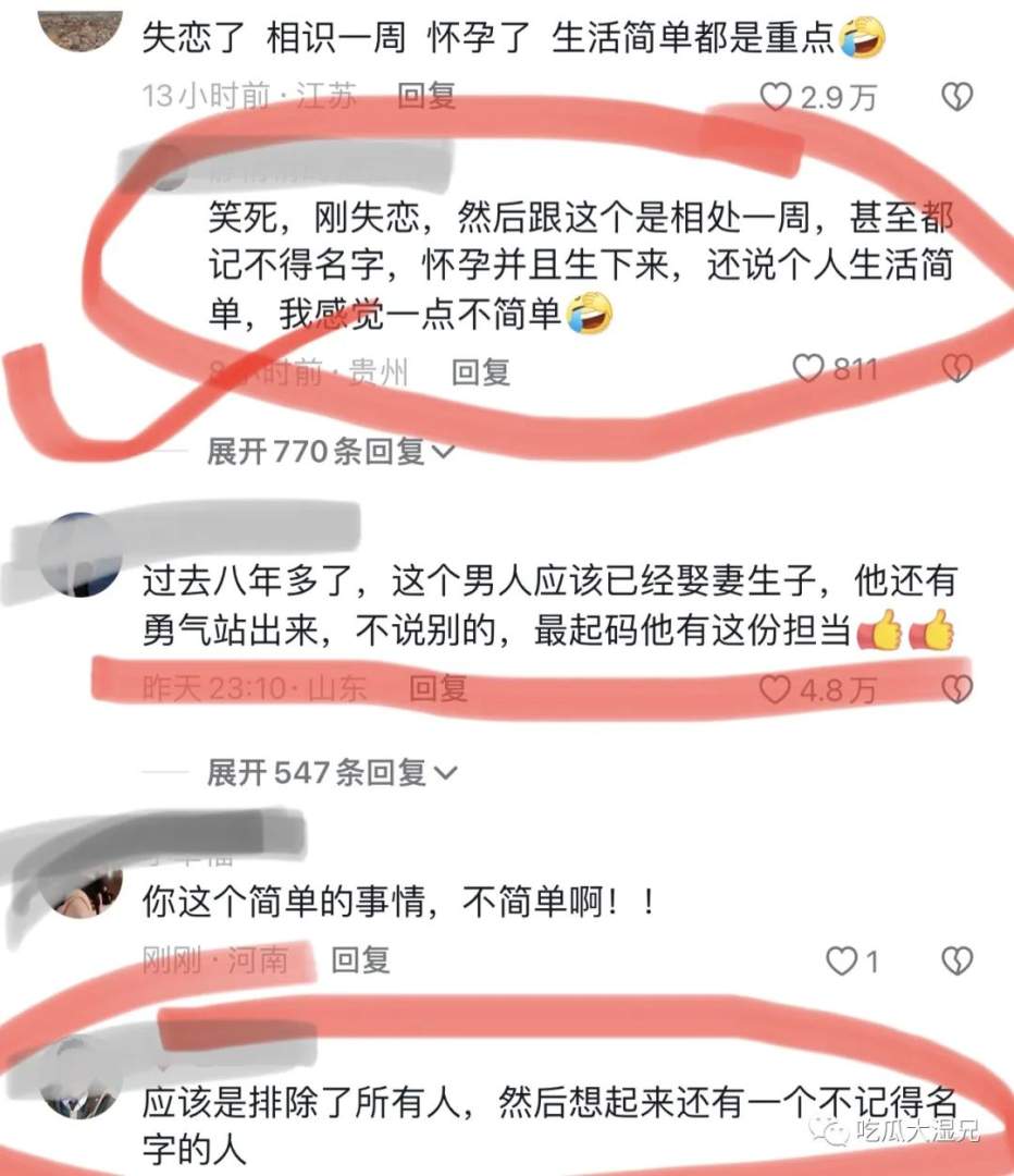 通过她吞吐的语气,和“刚刚失恋”“恋爱一周怀孕”“招架不住”等字眼来看,这女子不像是“个人生活简单”的样子啊!