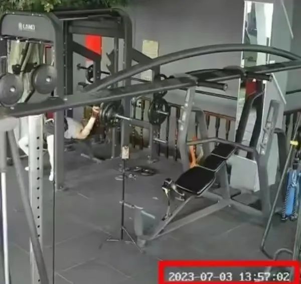 男子取下杠铃后无力支撑,杠铃压到脖子后数分钟内,男子无法自救不再动弹。