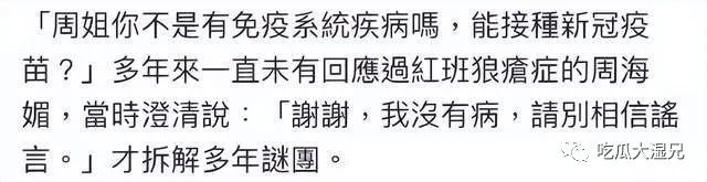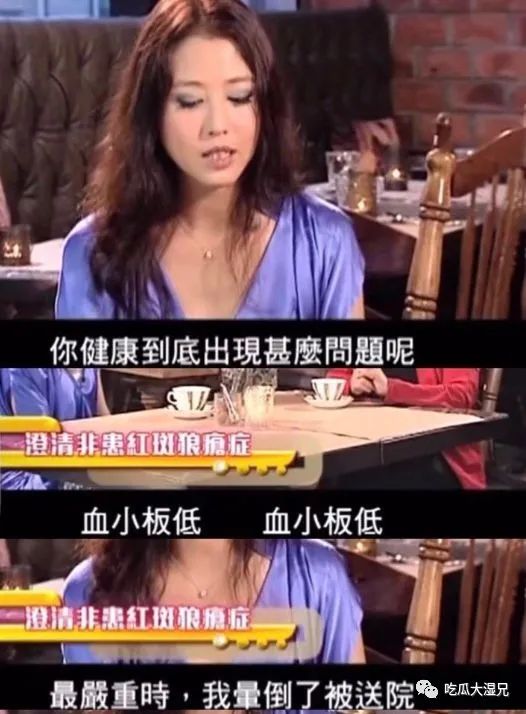 不过对于这个说法,周海媚多次否认过 ,表示自己不是患红斑狼疮症,而是血小板偏低,所以经常会感到晕眩,最严重的时候也确实晕倒送院过。