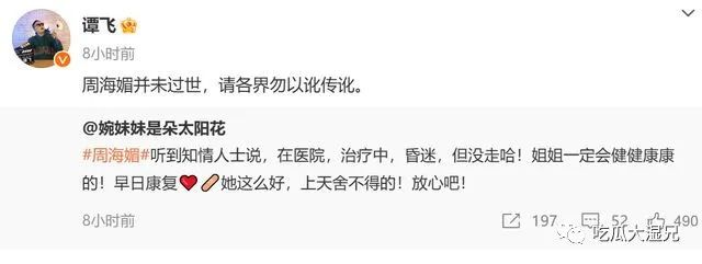 此前,还有业内人士谭飞辟谣称周海媚没有过世,让各界不要以讹传讹。表示周海媚是昏倒治疗中。
