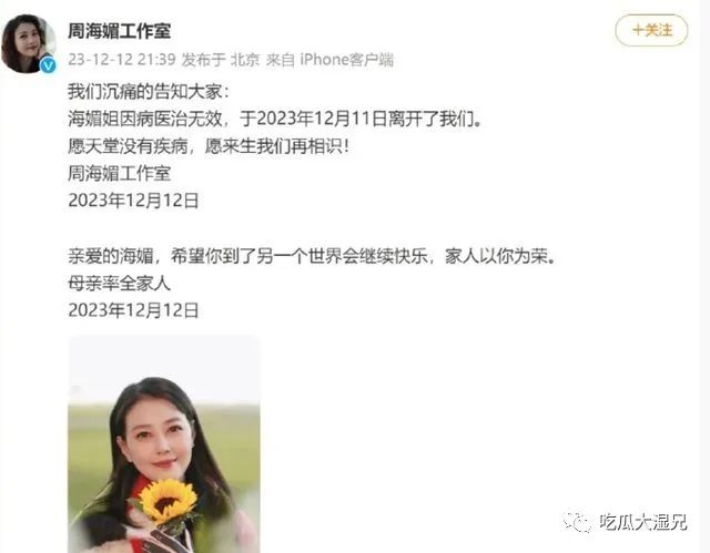工作室表示:“我们沉痛的告知大家,海媚姐因病医治无效,于2023年12月11日离开了我们。愿天堂没有疾病,愿来生我们再相识!”