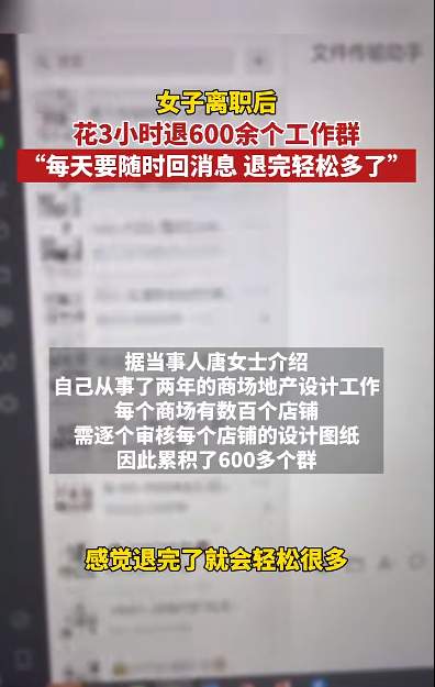 唐女士介绍,自己从事商场地产设计工作,每个商场有数百个店铺,需逐个审核店铺设计图纸,因此累积了600多个群。每天要随时回复信息,神经一直紧绷着。离职后花3个半小时退完所有群,轻松了很多,也直观地体会到职场的不易。