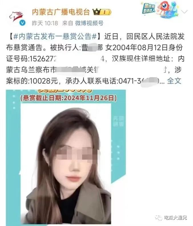 近日,呼和浩特市回民区人民法院发布悬赏公告,寻找被执行人曹某娜。曹某娜出生于2004年,涉案标的为10028元。悬赏公告中,年仅19岁的被执行人曹某娜照片容貌清秀,被网民戏称为“高颜值女老赖”。