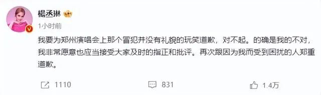 12月10日,杨丞琳为演唱会不当言语致歉,杨丞琳写道:“我要为郑州演唱会上那个冒犯并没有礼貌的玩笑道歉,对不起。的确是我的不对,我非常愿意也应当接受大家及时的指正和批评。再次跟因为我而受到困扰的人郑重道歉。”