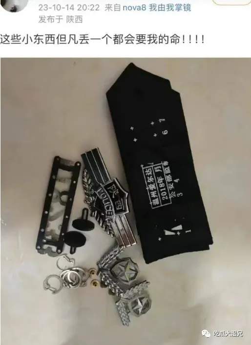 而根据该网民提供的其他截图显示,涉嫌“人肉”的人疑似西安市公安局阎良分局的一名警务人员。这位ID“别感动999”的网民曾在2023年10月14日发布一条微博,展示了警务人员的相关工作标识和证件信息,包括肩章、胸牌、胸扣等。根据其展示的身份标识,记者看到其警务编号疑似为“FJ8233”。