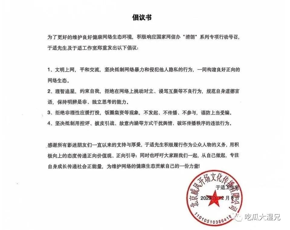 12月8日,于适工作室发布倡议书,呼吁粉丝文明上网,平和交流,坚决抵制网络暴力和侵犯他人隐私的行为。