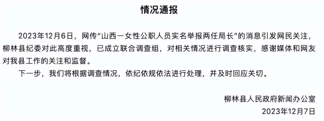 近日,山西一女性公职人员实名举报柳林县市场监督管理局前任局长李某和现任局长李某虎收贿受贿,李某虎还在办公室内与女性发生不正当关系。12月7日,当地对此发布通报称,已成立联合调查组,对相关情况进行调查核实。2023年12月6日,网传“山西一女性公职人员实名举报两任局长”的消息引发网民关注,柳林县纪委对此高度重视,已成立联合调查组,对相关情况进行调查核实,感谢媒体和网友对我县工作的关注和监督。下一步,我们将根据调查情况,依纪依规依法进行处理,并及时回应关切。