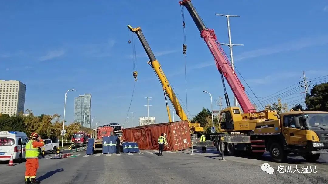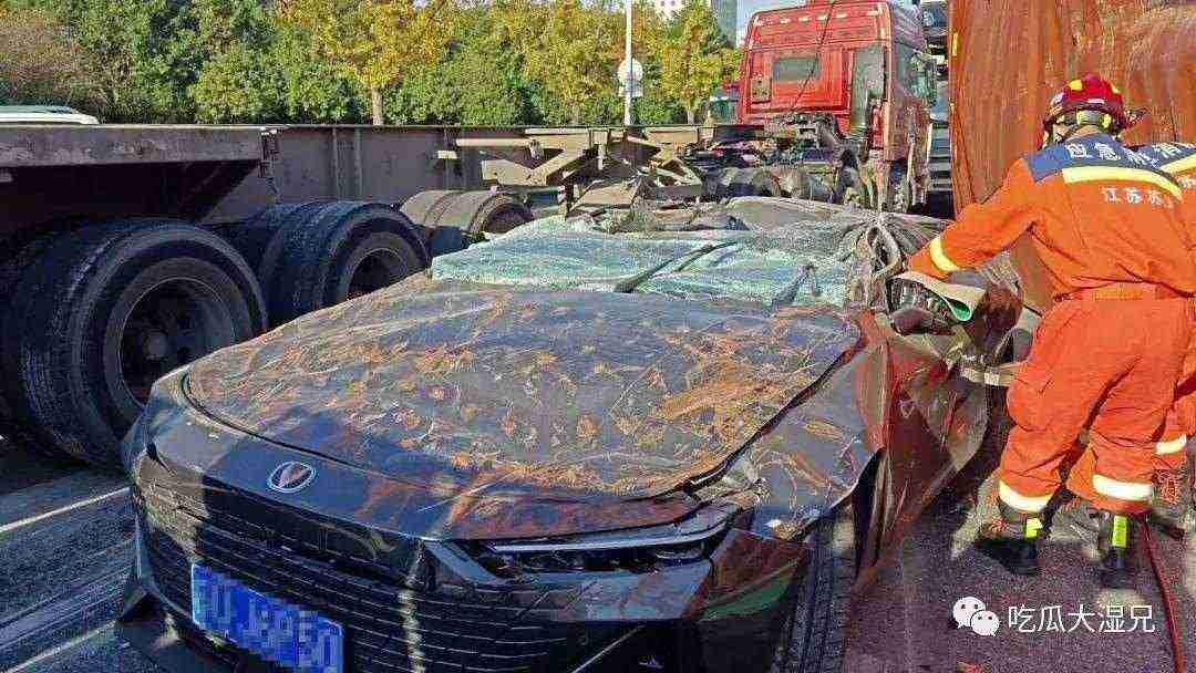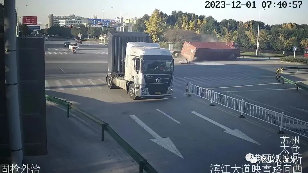 根据道路公共视频显示,当天7时40分许,苏州太仓,一辆红色集装箱货车在经过路口时,剐蹭到对向驶来的另一辆集装箱货车上,导致车箱侧翻,将一旁行驶的小轿车彻底压在车厢下。
