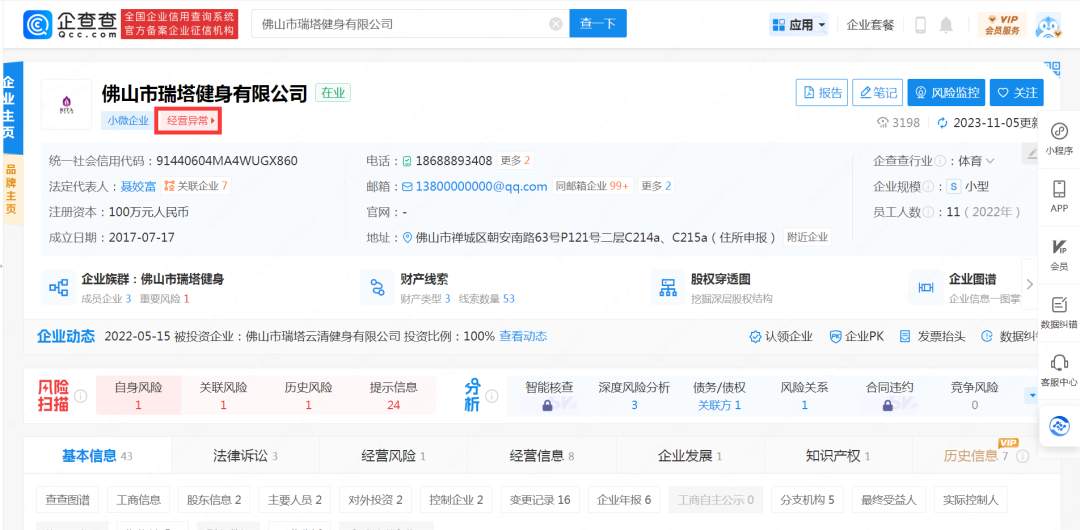 企查查显示,佛山市瑞塔健身有限公司成立于2017年,目前经营状态为开业,但已被标识为经营异常。公司经营范围为健身服务,法定代表人代表为聂姣富。