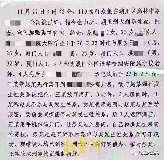 11月27日4时许,110接群众报警称在厦门市湖里区高林中路一公寓酒店被强奸。现嫌疑人均已到案,刑大已立强奸案侦办,拟对彭某、王某采取刑事拘留强制措施。