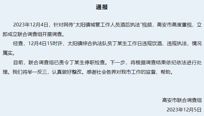 2023年12月4日,针对网传“太阳镇城管工作人员酒后执法”视频,高安市高度重视,立即成立联合调查组开展调查。经查,12月4日15时许,太阳镇综合执法队员丁某生工作日违规饮酒、违规执法,情况属实。目前,联合调查组已责令丁某生停职检查。下一步,将根据调查结果依纪依法进行处理。我们将举一反三,认真做好整改。感谢社会各界对我市工作的监督、帮助。此前,据网传视频显示,一男子对着两名身着城管制服的人拍摄视频,说“喝酒执法,一身酒气”。一名疑似正在开罚单的城管制服的人说,“什么喝酒执法,喝瓶啤酒也算喝酒执法?喝瓶啤酒算喝酒了吗?”另一段视频显示,男子对着身着城管制服者说,“(对方)喝酒执法,开罚单。”随后,将手中的罚单展示在镜头前。罚单显示《高安市村级组织收款收据》,时间为“2023年12月4日”,罚款理由为“大货车违规进入集镇”,金额“100元”,上面盖着“高安市太阳镇城镇管理执法大队”印章。据当事人讲述,12月4日,他前往太阳镇附近,遇到了一群身着城管制服的人,对方让他们交罚款,“我空车没有拉货,对方称镇里不允许走。我要求对方出具执法证,但对方没有出具,只说要开100元的罚单,不交钱就不让走……我着急装货就没和他纠缠。”当事人称,身着城管制服的工作人员拿出了个人收款码,用的是村里小组开具的收据,“交钱时我闻到他一身酒气,问他喝没喝酒,对方说喝一瓶啤酒不算喝酒。”根据转账记录显示,转账时间为12月4日下午3时35分许,金额100元转入私人账户。关于身着城管制服者是否系城管工作人员?罚款为何使用的是《村组织收款收据》?100元罚款为何转入私人账户?12月4日晚,华商报大风新闻记者联系到太阳镇政府,工作人员表示,他们接到了相关的投诉,已向领导反馈,正在调查核实。随后,相关负责人回应称,此事发生后他们高度重视,目前正在联系有关部门调查核实具体情况。