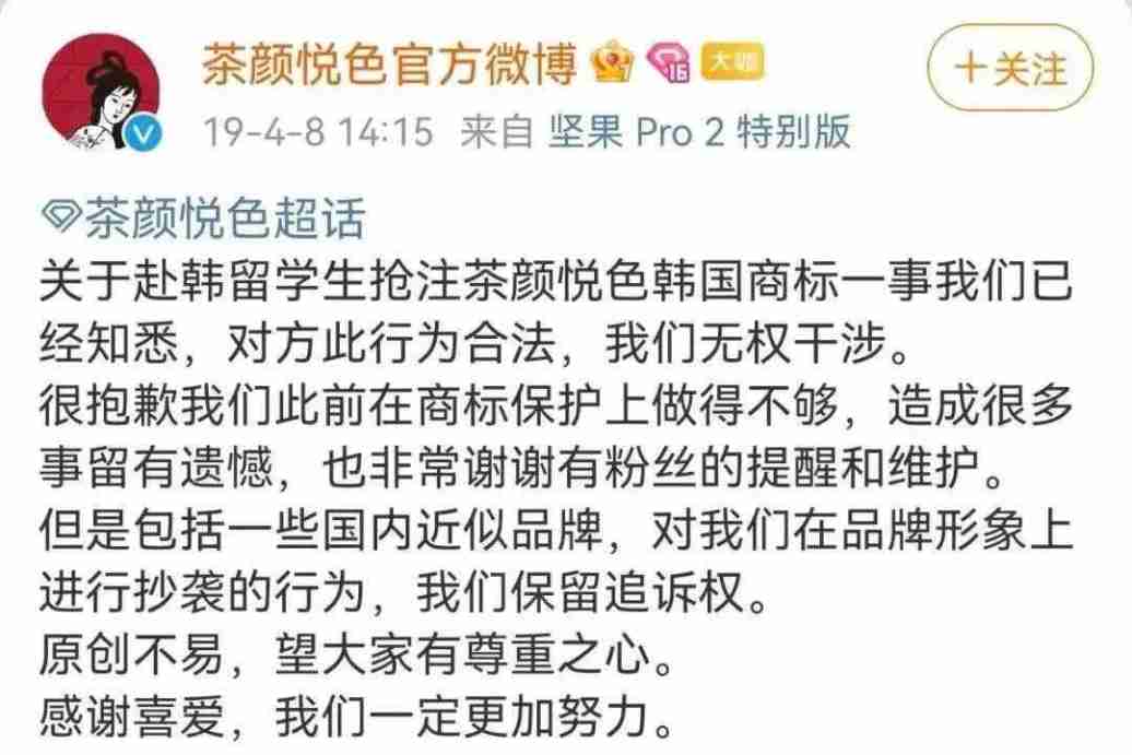 无独有偶,茶颜悦色也曾遇到过类似的海外商标抢注事件。2018年,一位出生在长沙的赴韩留学生,在韩国抢注了茶颜悦色的商标,开起了店。