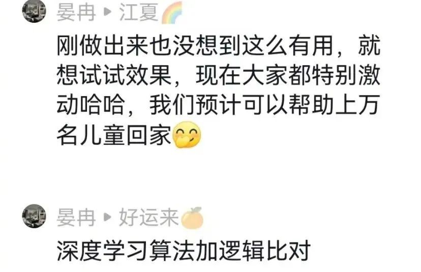 开发这项算法的公司表示,解清帅是公开出来的该算法协助找到的第四个孩子。预计还能找到上万名被拐儿童,研发这个app的团队真的配享太庙![[哆啦A梦吃惊]](/zb_users/upload/2024/05/wxsync-132020483664b6bebeee0c1716218859.png)