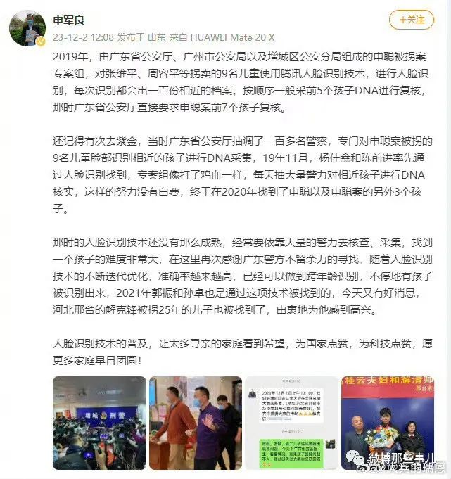 最近广受关注的解清帅,被拐时没有留下照片,是警方在高科技的算法下,用他的父母、兄弟姐妹的照片先把疑似的人捞出来,再综合跨年龄同亲缘人脸比对算法去进行排序,解清帅排到了第一名。