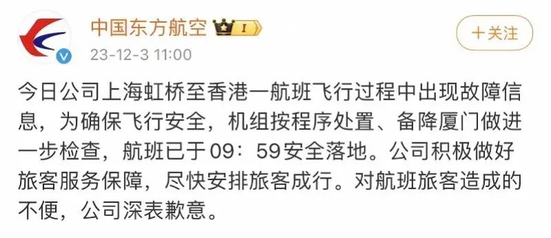 刚刚,@中国东方航空发布微博,称今日公司上海虹桥至香港一航班飞行过程中出现故障信息,为确保飞行安全,机组按程序处置、备降厦门做进一步检查,航班已于09:59安全落地。公司积极做好旅客服务保障,尽快安排旅客成行。对航班旅客造成的不便,公司深表歉意。