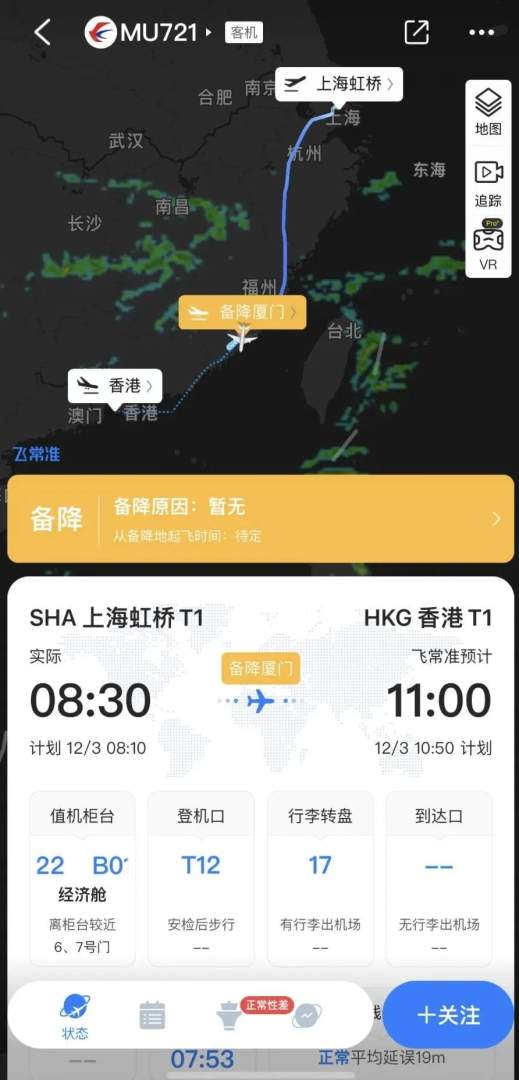 东方航空客服表示目前显示的航班动态是备降到厦门,备降原因显示为飞机维修影响,还不清楚具体情况。“厦门到香港这一段还没有起飞,目前看到飞机的机号有变,可能会换飞机,预期到下午3点半起飞。”