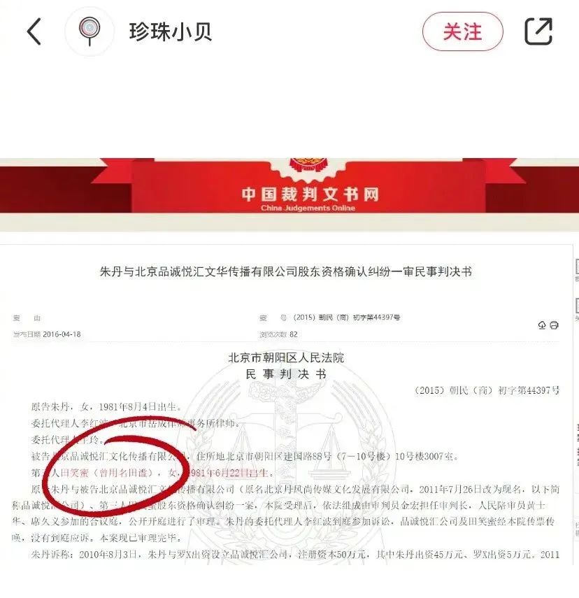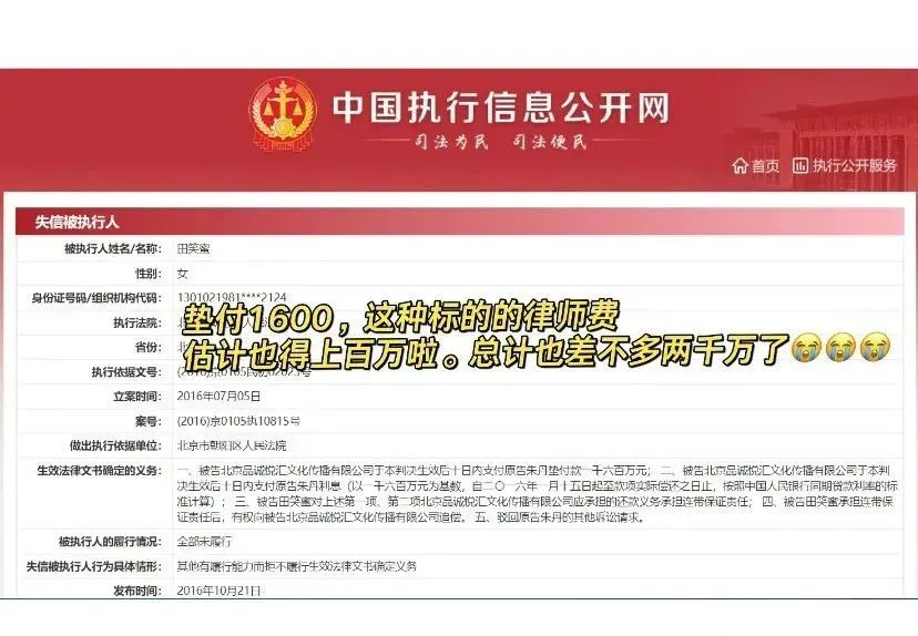 骗她的前闺蜜被判支付朱丹垫付款一千六百万未履行被列为失信人的执行单