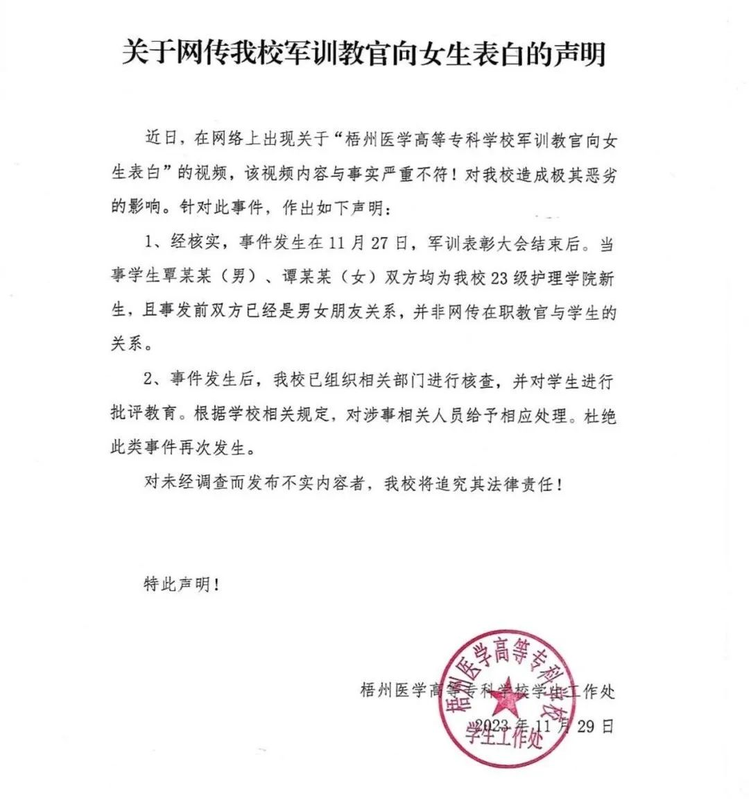 11月29日,广西梧州医学高等专科学校网站发布“关于网传我校军训教官向女生表白的声明”。近日,在网络上出现关于“梧州医学高等专科学校军训教官向女生表白”的视频,该视频内容与事实严重不符!对我校造成极其恶劣的影响。针对此事件,作出如下声明: