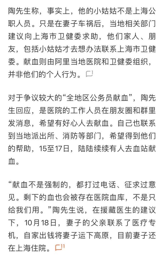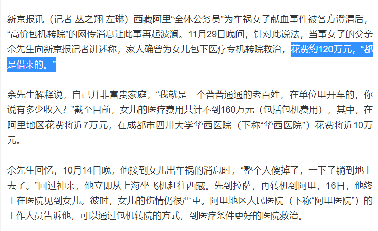 西藏阿里“全体公务员”为车祸女子献血事件被各方澄清后,“高价包机转院”的网传消息让此事再起波澜。