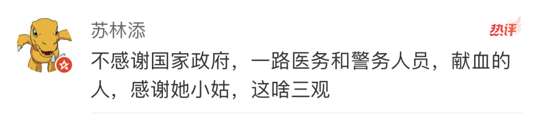 在今天的互联网时代,社交媒体已经成了人的属性,这个被救活的小姑娘的社交媒体属性要多糟糕有多糟糕,这个小姑娘的糟糕是感性的,正像这个评论区网友开骂的:这个姑娘救起来“一不感谢国家府,一路医务和警务人员,献血的人,感谢她小姑,这啥三观”。