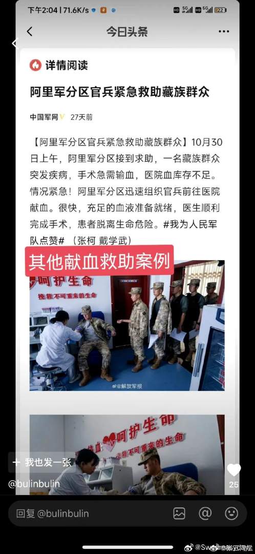 西藏是高原地区,很多平原地区的小病,到了高原地区就会成为要命的绝症,所以西藏一直有全体动员救人的传统,从孕妇到小孩,从公务人员到边防士兵,这种众志成城拯救生命的接力行为,在雪域高原上不知道上演了多少次,今天既然以这样的形式被解构和讨论,如果这导致几十年的传统被舆论击碎,救人变的小心翼翼,命令下的流程繁琐,那损失的只有你我。