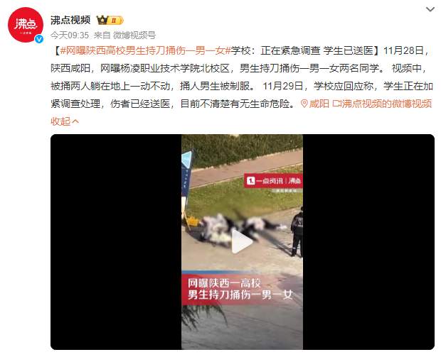 11月28日,陕西咸阳,网曝杨凌职业技术学院北校区,男生持刀捅伤一男一女两名同学。视频中,被捅两人躺在地上一动不动,捅人男生被制服。11月29日,学校应回应称,学生正在加紧调查处理,伤者已经送医,目前不清楚有无生命危险。