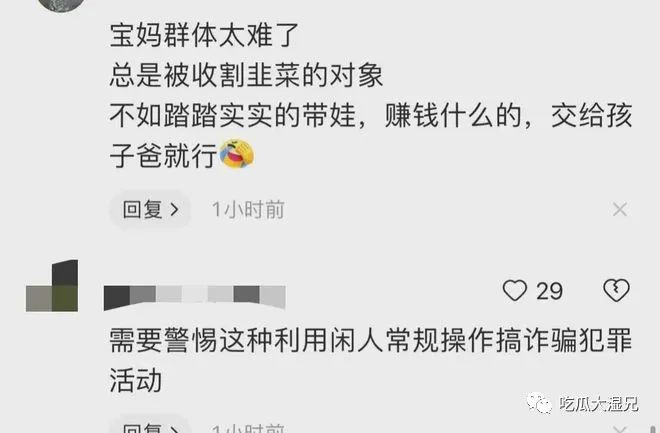 网友C说:宝妈群体太难了,总是被收割韭菜的对象,不如踏踏实实的带娃,赚钱什么的,交给孩子爸就行。