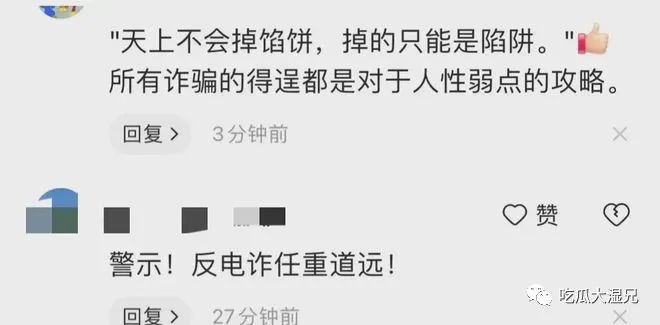 网友B说:天上不会掉馅饼,掉的只能是陷阱。所有诈骗的得逞都是对于人性弱点的攻略。