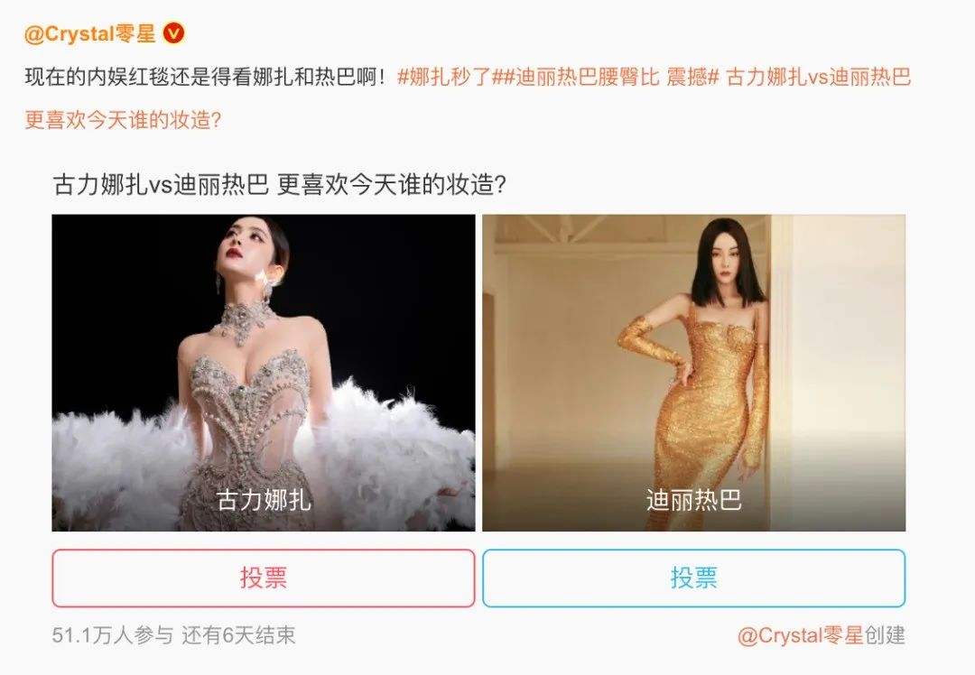 Angelababy的这次被禁,让很多女星都看上了她的位置,最近微博上争艳的话题不断 一个#三毛 审美#,一个#迪丽热巴腰臀比 震撼#,一个#娜扎秒了#还爆了,大概率是想趁Angelababy沉寂的时候,坐稳红毯美神的宝座。