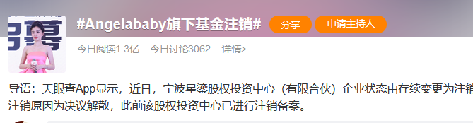 自从被微博、抖音平台“禁言”后,艺人Angelababy杨颖传来了新的投资动向。 明星Angelababy杨颖旗下私募基金注销 据企查查显示,近日,宁波星鎏股权投资中心(有限合伙)企业状态由存续变更为注销,注销原因为“决议解散”。 该股权投资中心成立于2015年5月,为AB Capital旗下私募基金,其执行事务合伙人为上海星弥资产管理有限公司,出资额1.8亿人民币。黄晓明、Angelababy于2015年注册结婚。 公开信息显示,AB Capital是由Angelababy杨颖成立的创投基金,董文英则是杨颖多个工作室的执行事务合伙人和投资人。 杨颖工作室多由董文英注册,董文英共在14家企业中担任法定代表人职务,其中包含,杨颖时代影视文化传播新沂工作室、杨颖世纪影视文化传播新沂工作室、杨颖影视文化传播新沂工作室等。 值得注意的是,宁波星鎏股权投资中心(有限合伙)企业的发起人之一是黄晓明,认缴出资金额为1.08亿元,实缴出资额为60万元。但在2022年4月,黄晓明退出了该企业。 2022年1月28日,黄晓明、Angelababy发文官宣离婚。双方在社交平台写下:“感恩过去所有,未来仍是家人!” Angelababy的这次被禁,让很多女星都看上了她的位置,最近微博上争艳的话题不断 一个#三毛 审美#,一个#迪丽热巴腰臀比 震撼#,一个#娜扎秒了#还爆了,大概率是想趁Angelababy沉寂的时候,坐稳红毯美神的宝座。 娜扎,真正的摇曳生姿 迪丽热巴腰臀比 震撼 两家直接对上了 不过,从结果来看,古力娜扎遥遥领先