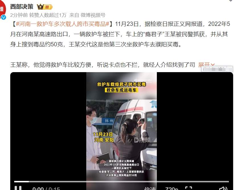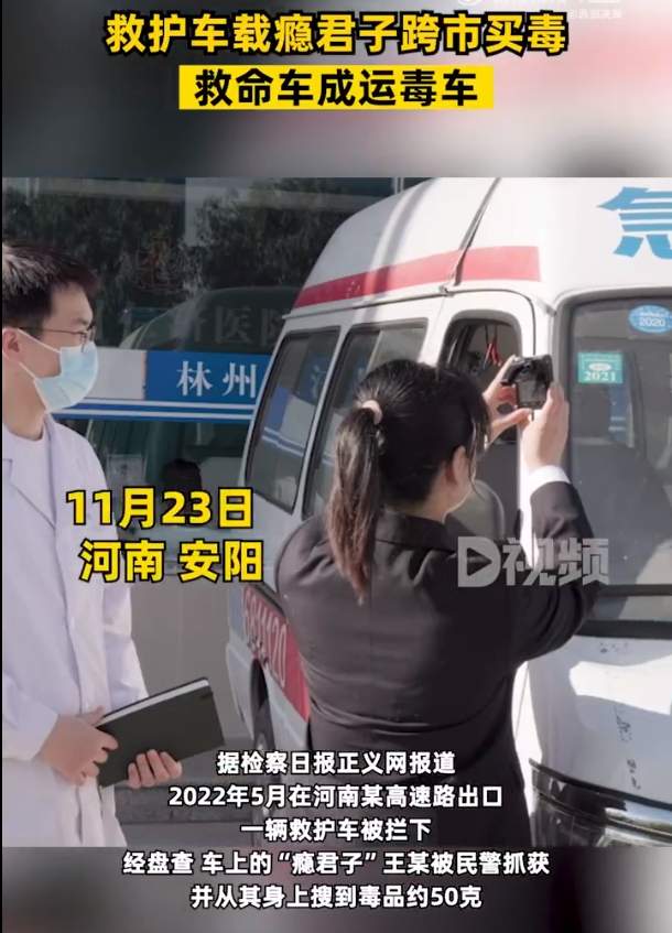 11月23日,据检察日报正义网报道,2022年5月在河南某高速路出口,一辆救护车被拦下,车上的“瘾君子”王某被民警抓获,并从其身上搜到毒品约50克,王某交代这是他第三次坐救护车去濮阳买毒。