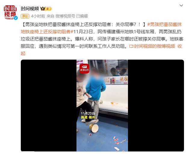11月23日,网传福建福州地铁1号线车厢,两男孩乱扔垃圾还把番茄酱抹座椅上。爆料人称,问孩子家长在哪时还被㨃关你屁事。地铁客服回应,遇到类似情况可第一时间联系工作人员劝阻。