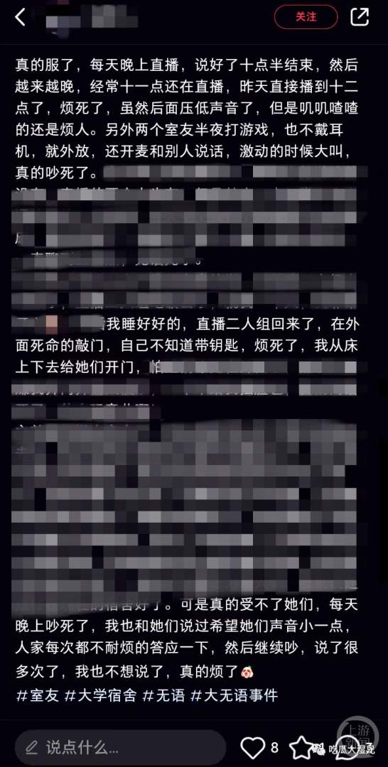在某社交平台搜索“室友在宿舍直播”,上游新闻记者发现超过50篇笔记都是有关大学生寝室直播引发室友不满:“每天晚上吵死了,我也和她们说过希望她们声音小一点,人家每次都不耐烦地答应一下,然后继续吵”“我觉得在寝室直播就是不合适啊,但是想不到什么严肃有效的理由让她不直播,求大家帮忙出谋划策一下”……