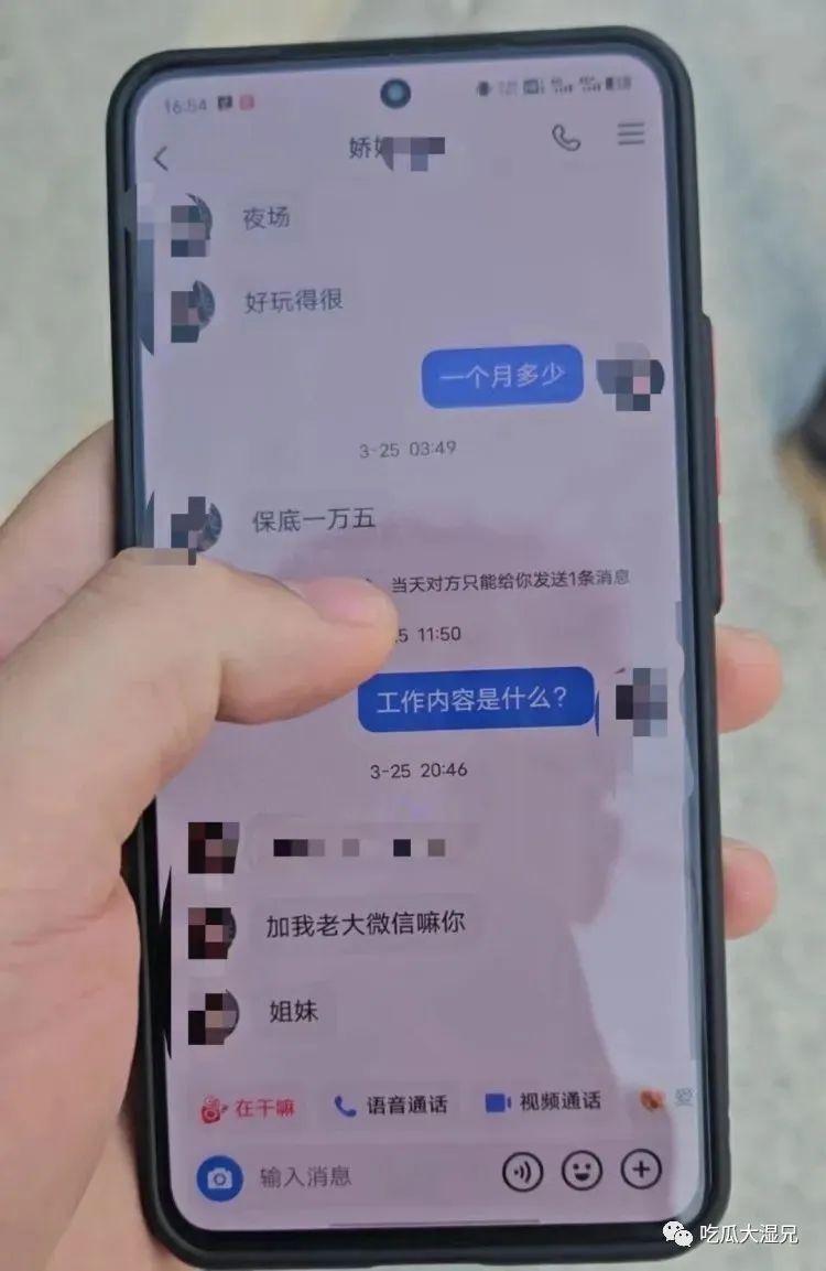 丹丹告诉上游新闻记者,在她因为年龄原因快被火锅店辞退时,碰巧在网络平台上接到了娇娇的工作邀约。聊天记录显示,娇娇问:“交个朋友可以不?”丹丹回复:“可以!”对方问她找不找工作,并进一步介绍,“在夜场,好玩得很”,收入是“保底1.5万”。