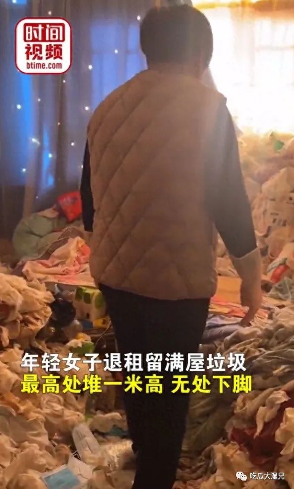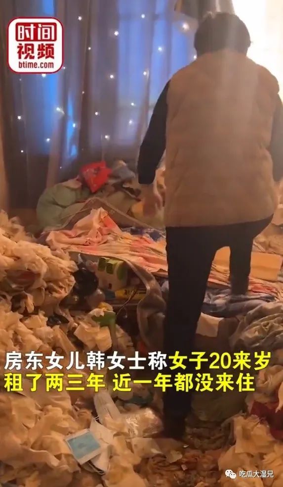 据房东女儿韩女士介绍,租房女子20来岁,租了两三年,近一年都没来住,但按月交房租。最近要退租,自己母亲去时发现开门都推不开门,屋里全是卫生纸、外卖盒等垃圾,她和母亲2人花3小时收拾出20多袋垃圾。