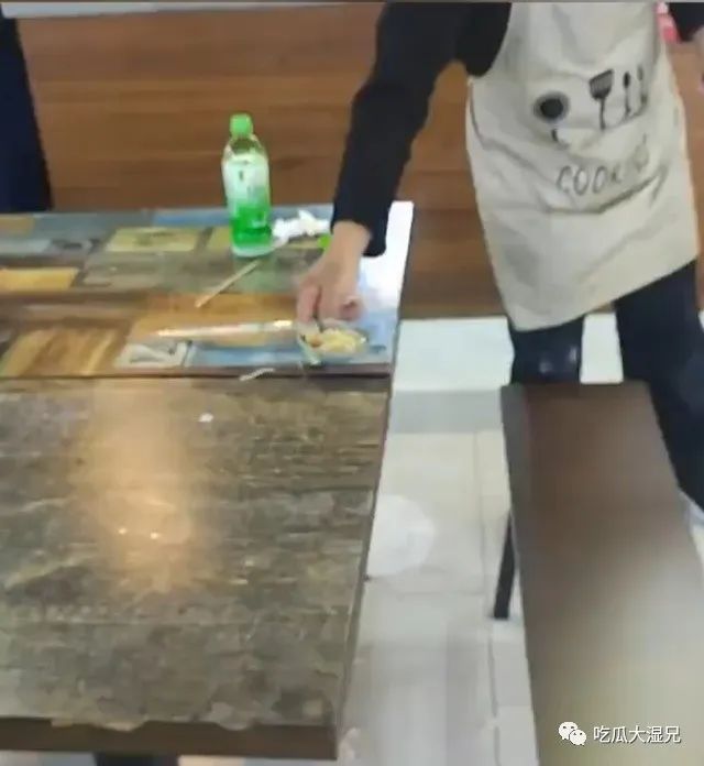 画面中,美食城一档口前放着几个小碗,里面是供顾客就餐的小料。一位身着黑色衣服围着围裙的工作人员将一桌已走客人剩下的小料拿走,重新倒回小料区。