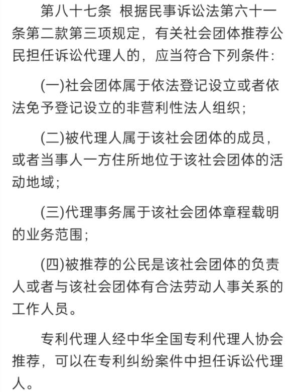 2.《最高人民法院关于适用<中华人民共和国民事诉讼法>的解释》第八十七条规定:根据民事诉讼法第六十一条第二款第三项规定,有关社会团体推荐公民担任诉讼代理人的,应当符合下列条件:(一)社会团体属于依法登记设立或者依法免予登记设立的非营利性法人组织;(二)被代理人属于该社会团体的成员,或者当事人一方住所地位于该社会团体的活动地域;(三)代理事务属于该社会团体章程载明的业务范围;(四)被推荐的公民是该社会团体的负责人或者与该社会团体有合法劳动人事关系的工作人员。专利代理人经中华全国专利代理人协会推荐,可以在专利纠纷案件中担任诉讼代理人。