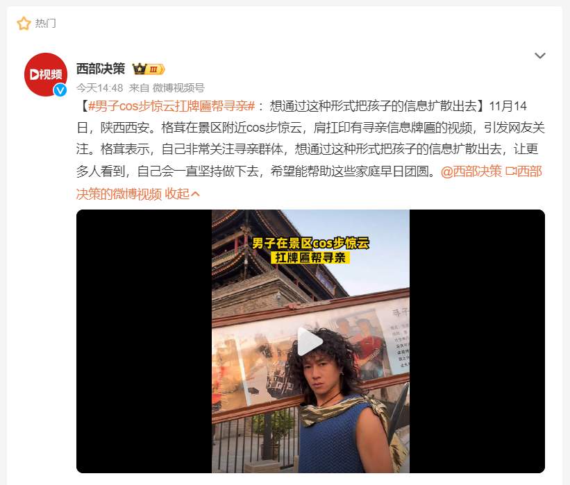 这位男子名叫格茸,是云南香格里拉人。对于自己的行为,格茸解释道,他希望通过这种形式,让更多的人看到这些寻亲信息。他认为,cosplay是一种能吸引人们注意力的方式,他希望通过这种方式,帮助这些家庭早日找到失散的孩子。