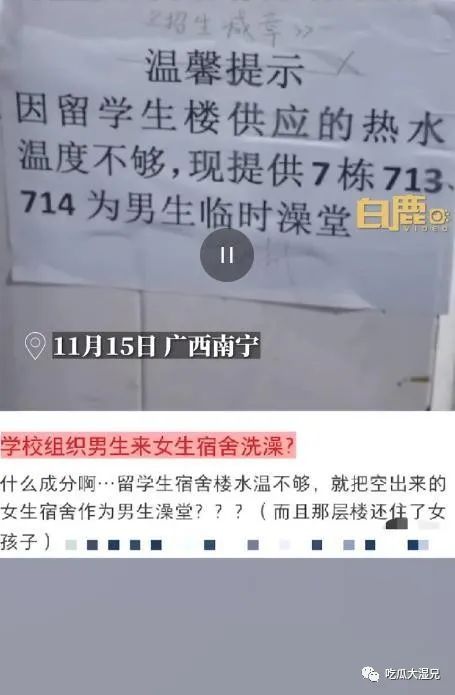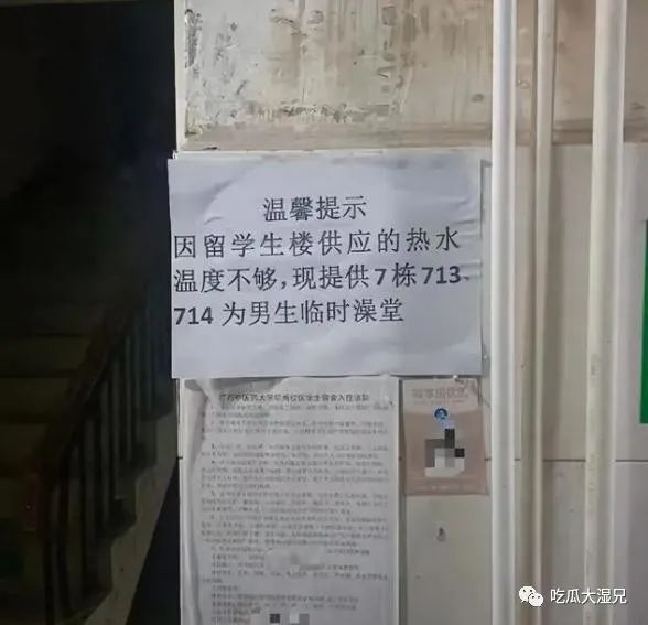 11月15日,有网友反映称,广西中医药大学为了解决留学生宿舍楼热水温度不足的问题,竟然让男生进入女生宿舍洗澡。在女生宿舍楼下的告示板上明确写着:“因留学生宿舍楼供应的热水温度不够,现提供7栋713、714为男生临时澡堂。”这样的安排引发一片哗然。