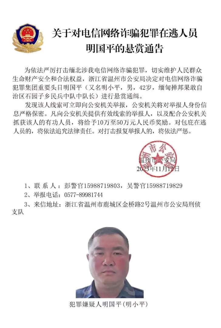 经浙江省温州市公安机关侦查发现,明学昌、明国平、明菊兰、明珍珍系缅北果敢自治区涉我电信网络诈骗犯罪集团重要头目,以明学昌为首的犯罪集团长期组织开设诈骗窝点,公开武装护诈,实施针对中国公民的电信网络诈骗犯罪活动,诈骗数额巨大,在公安机关严打高压态势下,仍不收敛,不收手,继续大肆组织实施违法犯罪活动,同时涉嫌故意杀人、故意伤害、非法拘禁等多种严重暴力犯罪,情节极其恶劣,后果极其严重。