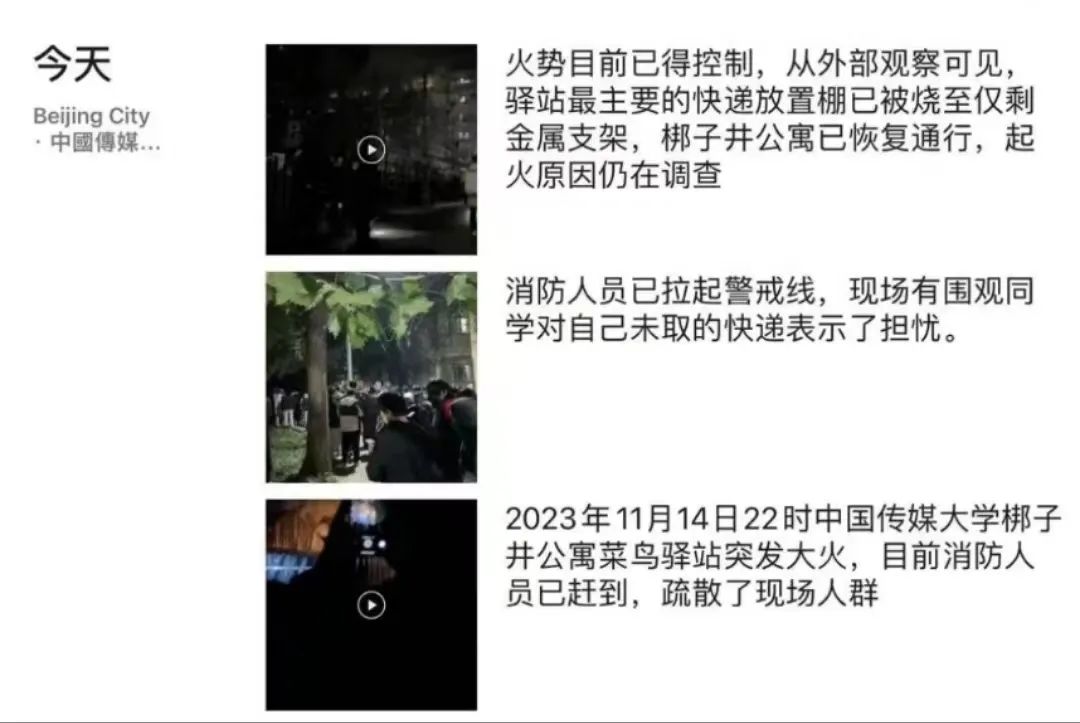 11月14日22时许,北京市朝阳区中国传媒大学梆子井学生公寓旁,一菜鸟驿站发生火灾,火势最高达3米左右。