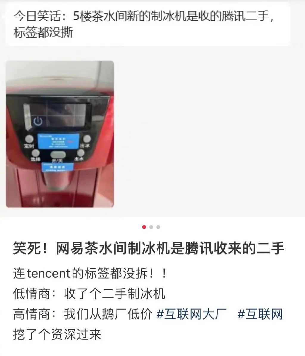 近日,有网易员工发帖称,发现公司的制冰机疑似从腾讯收来的二手,此事在网络上引发热议。甚至有网友神评称:连制冰机都有两段大厂实习经历”。