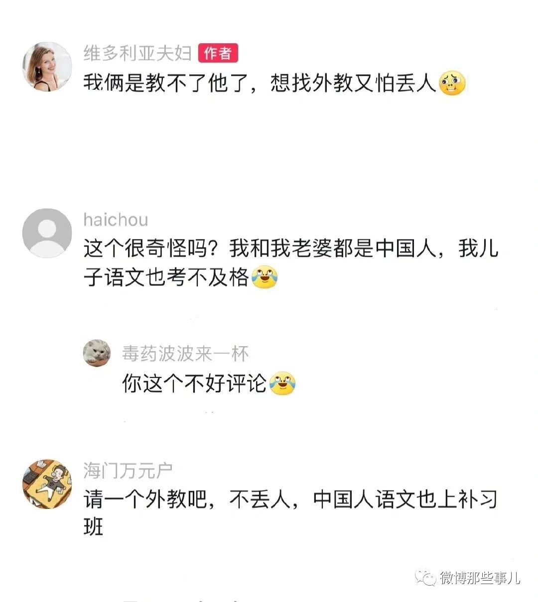 :“想找外教又怕丢人”哈哈哈哈哈哈哈哈 不是玫瑰也铿锵:想起早些年碰上的住在青岛、来京旅游的德国一家人,父母都是慕尼黑大学毕业的高级工程师,英德汉三语精通,儿子是上高一的金发碧眼帅小伙儿,张嘴跟黄渤一样,问哪科最难,小伙儿一拍大腿:英语,太TM难了![[doge]](/zb_users/upload/2024/05/wxsync-2064184629664b6d91ba39b1716219281.png)