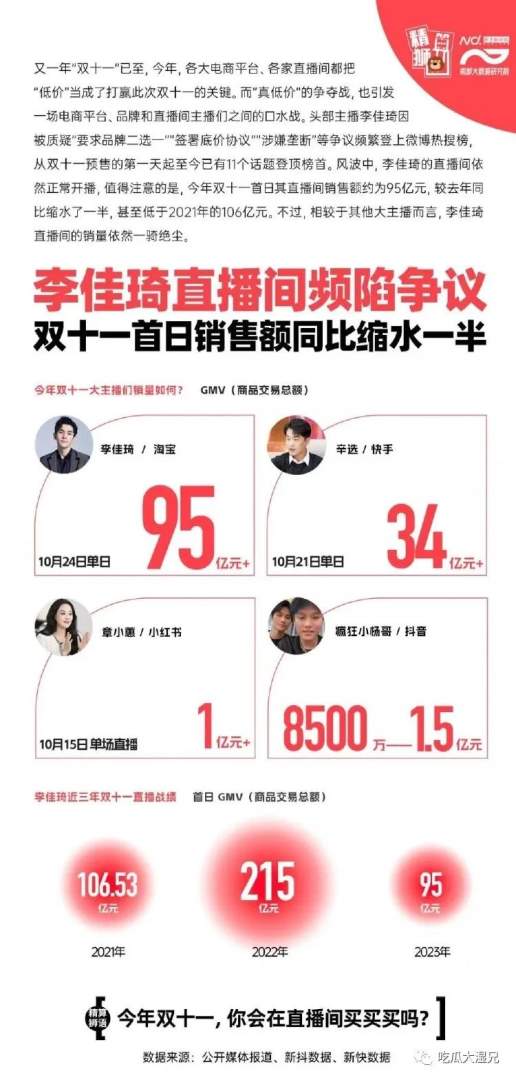 南都大数据研究院回顾了以往两年李佳琦直播间双十一预售首日的销量。数据显示,2022年双十一首日,李佳琦直播间的GMV销售额约215亿元;2021年双十一预售首日,这一数据是106亿元。今年的GMV销售额是三年里最低的。
