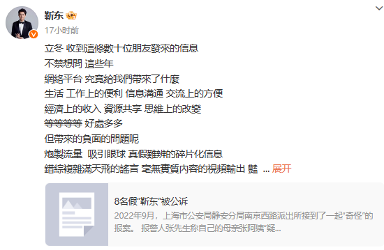 其称,这些年网络平台给人们带来了诸多好处,但也产生了炮制流量、吸引眼球、碎片化信息、谣言、艳俗内容等种种问题。