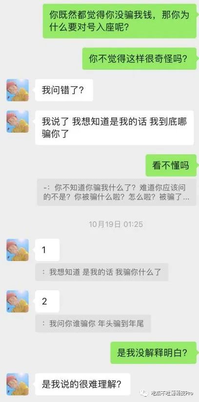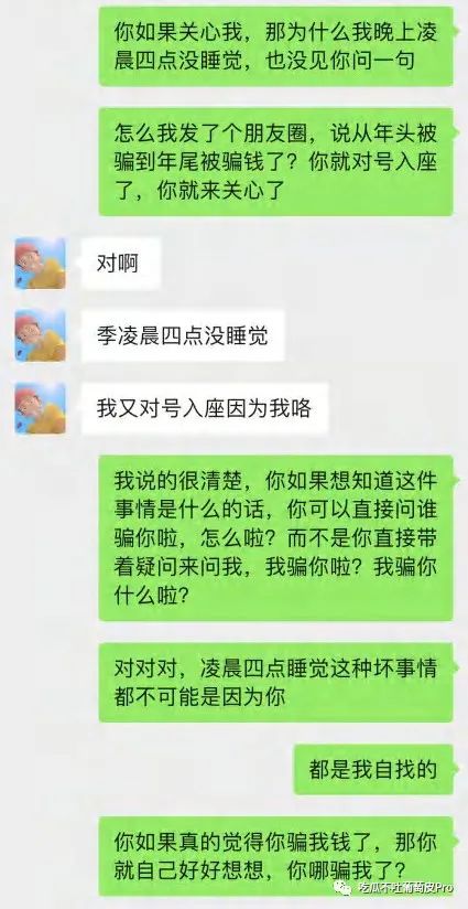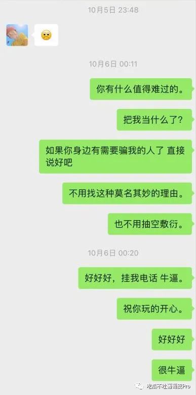 然后,见到我这么说话,他又开始转移话题啦。我当时买罐头被诈骗了,发了个朋友圈,人家当时看到不说,到我说他有问题的时候他就开始拿出来怼我了。本来觉得和被绿这事儿无关不想分享,但仔细想想应该是骗了。我恼羞成怒,附图,大家看个乐呵。