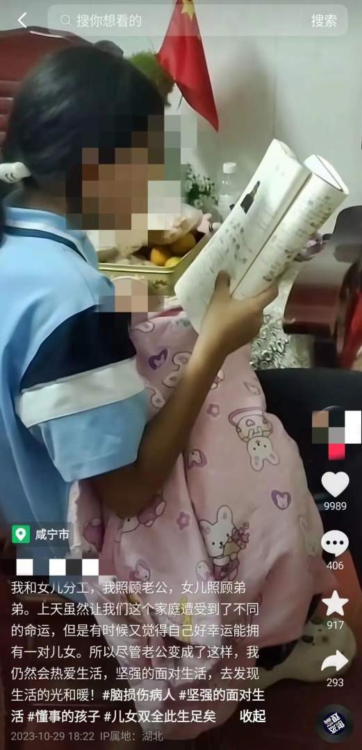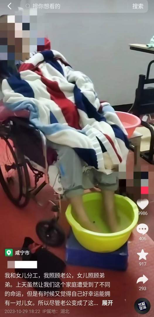 近日,该博主又发布视频称,自己和女儿分工,自己照顾丈夫,女儿照顾幼子。视频显示,其坐在轮椅上的丈夫正在泡脚,看似初中生模样的女儿,则边看书边抱着在襁褓中熟睡的弟弟。