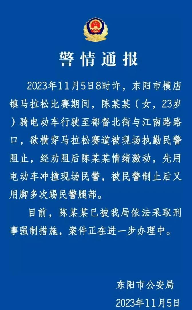 11月5日,浙江金华东阳市横店镇江南路与都督北街因马拉松比赛,实施临时交通管控。一女子在交通管控区域与民警发生争执,多次辱骂踢踹民警。